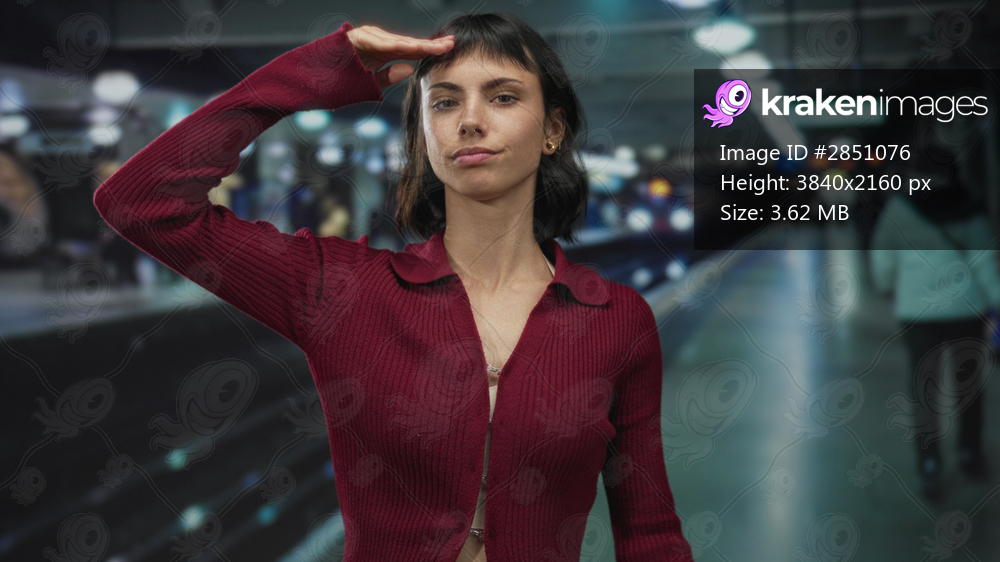 Young hispanic woman salutes with hand to forehead in a modern urban railway building under fluorescent lights; duty respect pride.