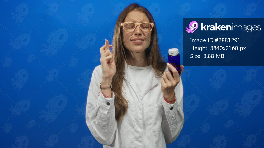 Young hispanic woman scientist holding a pill bottle with fingers crossed in blue studio; hope trust.