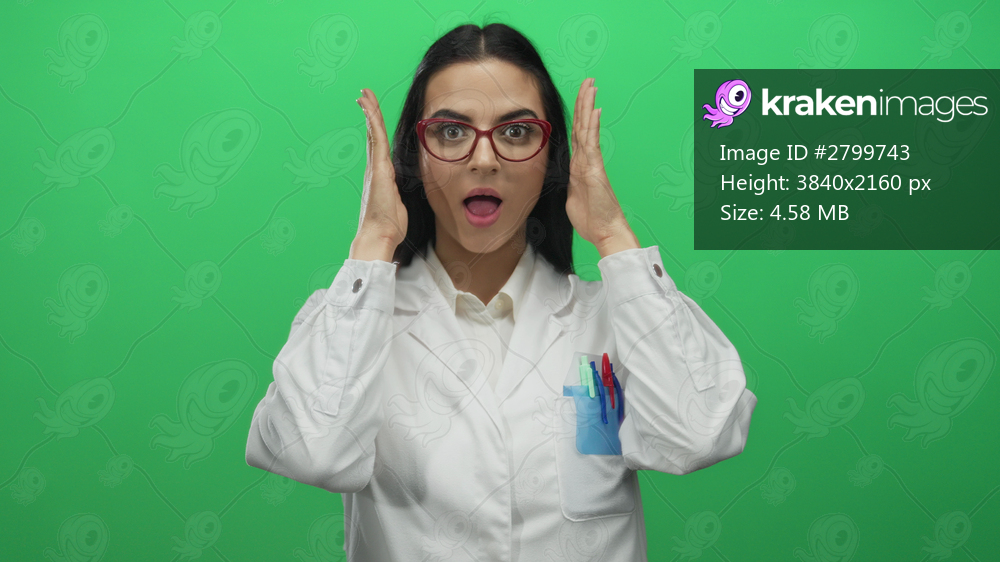 Young hispanic woman scientist in a white uniform making expressive gestures against a vibrant green wall background communicates creativity and innovation. - Kraken Images