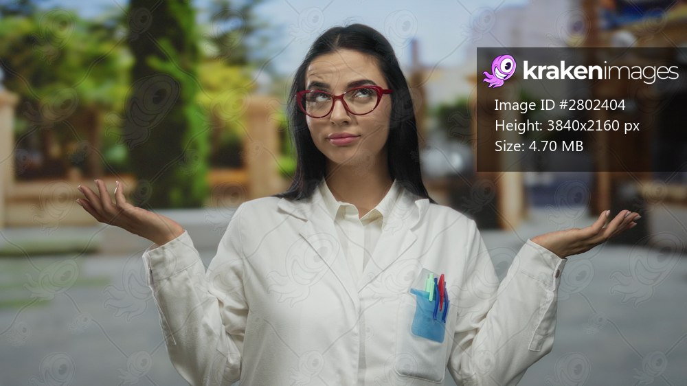 Young hispanic woman scientist in uniform outdoors on a street showing curiosity and focus with trees and building background.