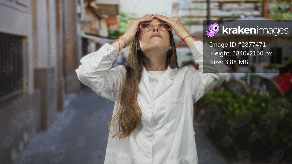Young hispanic woman scientist in white lab coat with hands on forehead looking up while standing on a busy street near cafe tables; stress resilience. - Kraken Images