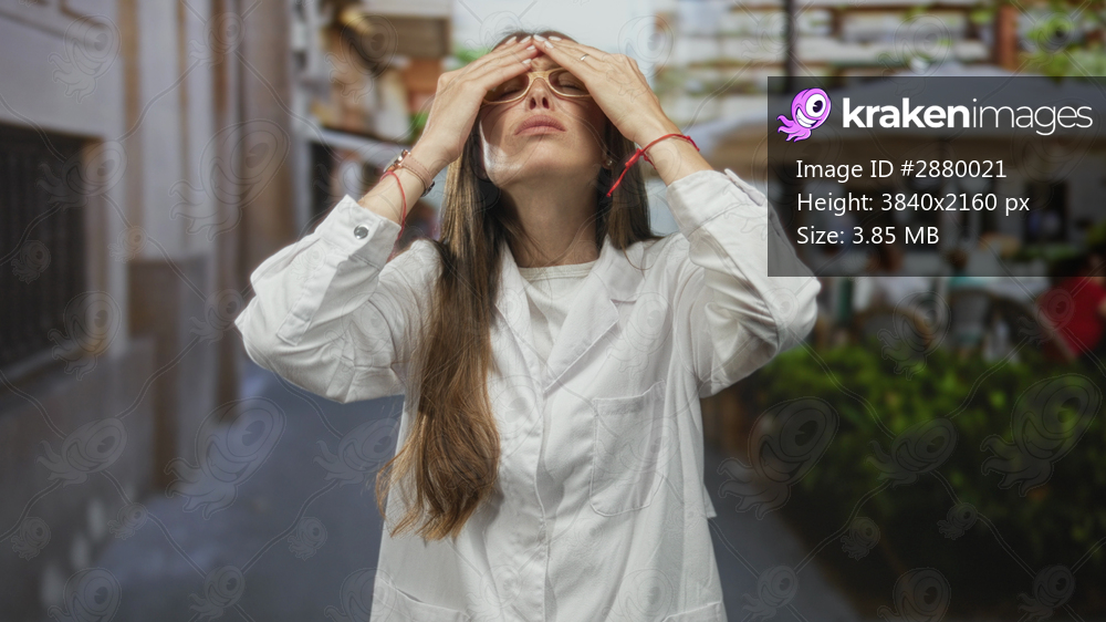 Young hispanic woman scientist in white lab coat with hands on forehead looking up while standing on a busy street near cafe tables; stress resilience. - Kraken Images