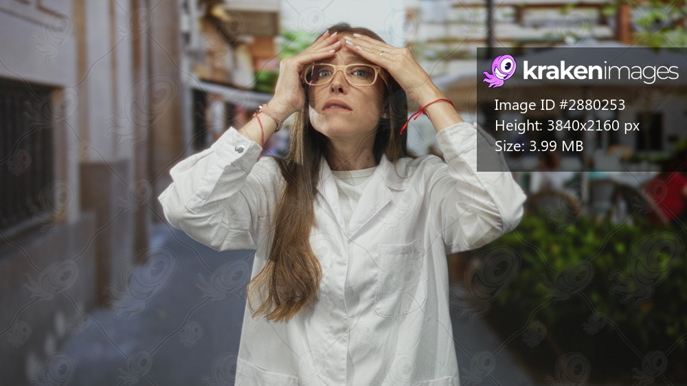 Young hispanic woman scientist in white lab coat with hands on forehead looking up while standing on a busy street near cafe tables; stress resilience. - Kraken Images