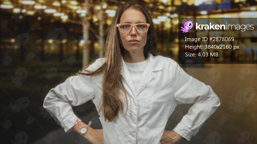 Young hispanic woman scientist in white lab coat stands with hands on hips in front of glass building at night; determination curiosity research.