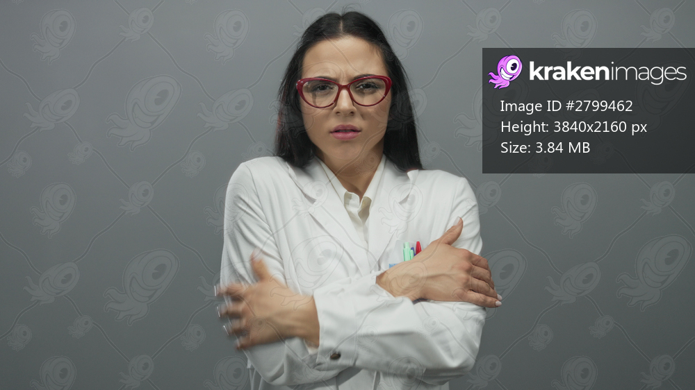 Young hispanic woman scientist in white uniform feeling cold against a grey wall background with arms crossed and red glasses visible.