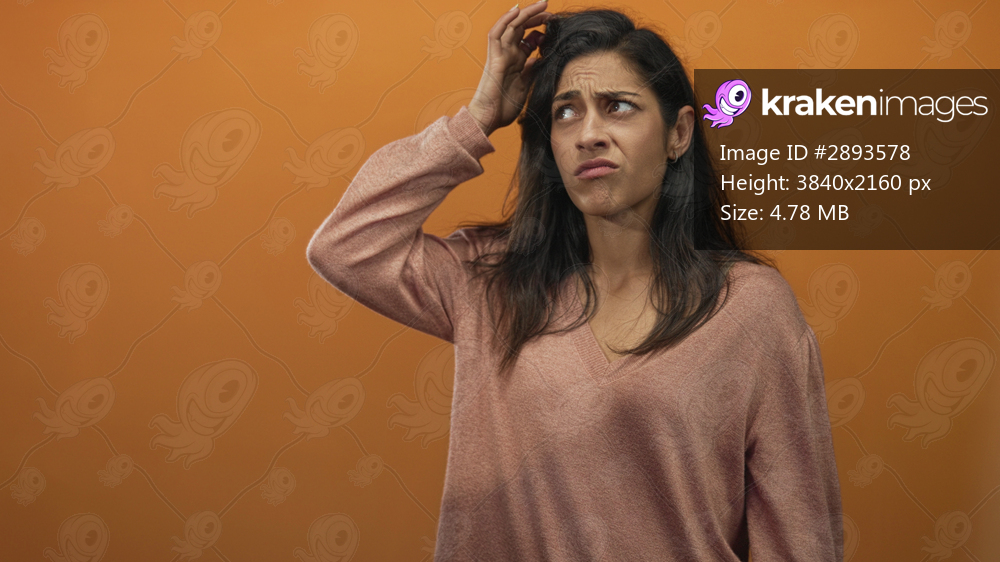 Young hispanic woman scratches her head with hand wearing pink sweater in orange studio setting; confusion.