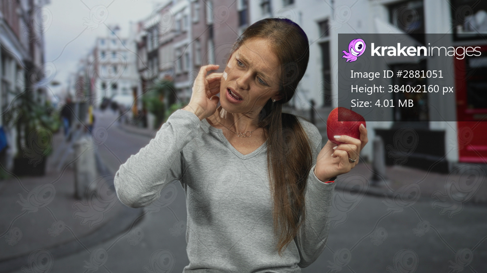Young hispanic woman scratches neck while holding a red apple on a street; discomfort food dilemma moment.