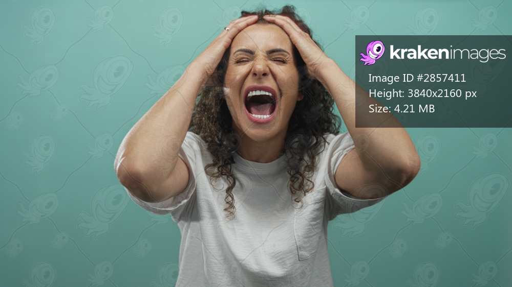 Young hispanic woman screaming with mouth wide open in a mint green studio setting; frustration.
