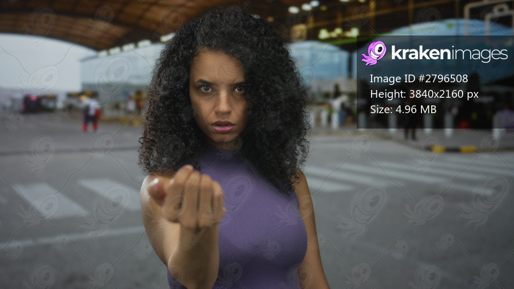 Young hispanic woman with serious expression points finger to camera at airport departure terminal building; invitation.