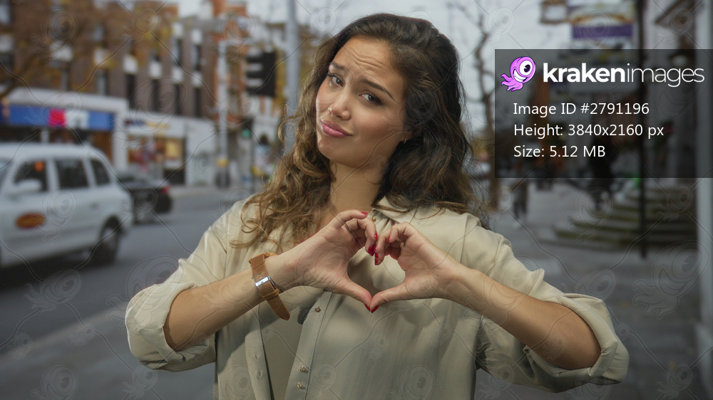 Young hispanic woman shaping heart gesture with hands at urban street intersection near blurred buildings and traffic; love.