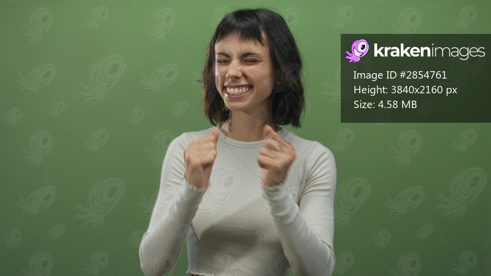 Young hispanic woman with short black hair wearing a white crop top and pointing fingers in studio; confidence.