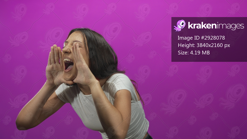 Young hispanic woman shouting with hands cupped to mouth in magenta studio; youthful energetic excitement.