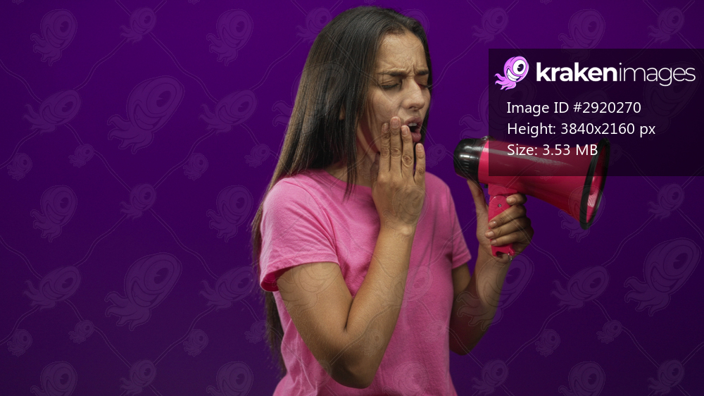 Young hispanic woman shouting into pink megaphone with hand on cheek in purple studio; frustration protest.