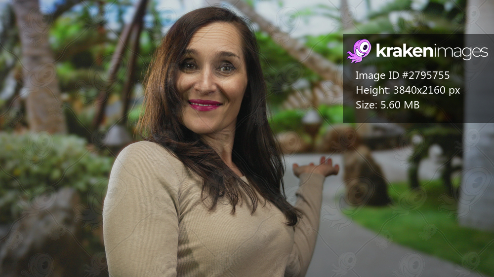 Young hispanic woman showing bare arms with open palm toward walkway in green park; invitation welcome.