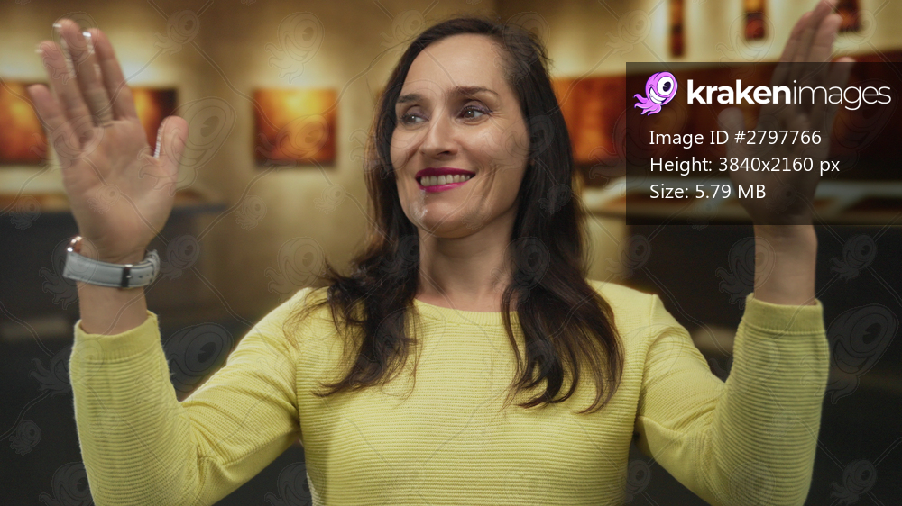 Young hispanic woman showing large hand span gesture in an art museum gallery indoors; communication emphasis explanation demonstration.