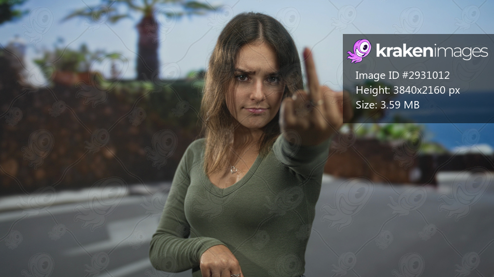Young hispanic woman showing middle finger and pointing index finger toward camera on street by seaside wall; bold defiance.