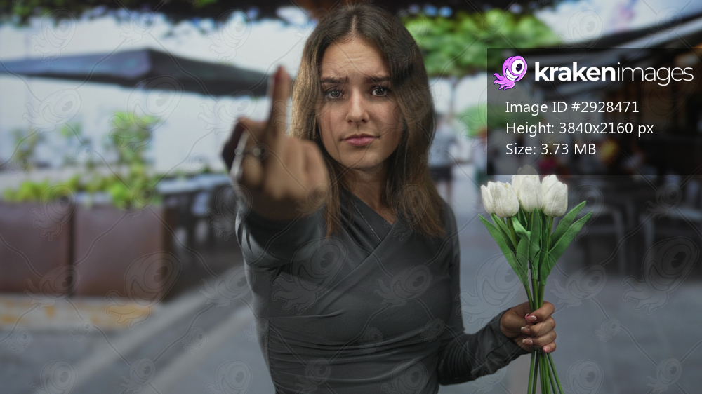 Young hispanic woman showing middle finger to camera while holding bouquet of white tulips on a restaurant terrace by the street; defiance.