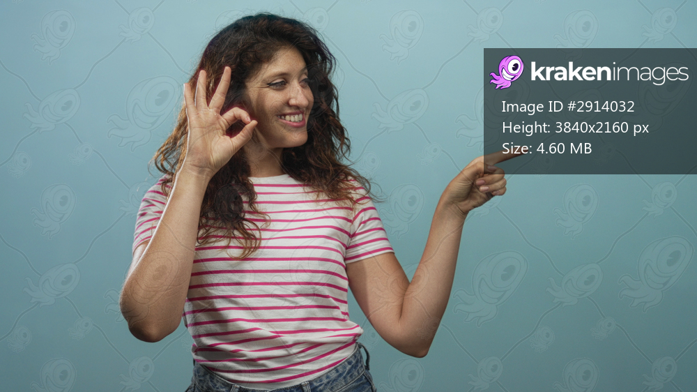 Young hispanic woman showing ok sign with both hands in blue studio wearing striped tshirt and jeans; confidence approval.