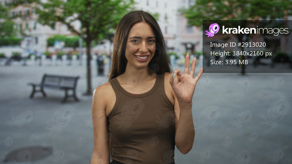 Young hispanic woman showing ok sign with raised hand and visible shoulder on city street plaza bench, smiling at camera; approval.