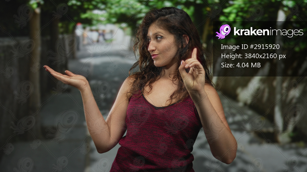 Young hispanic woman showing open palm and pointing finger on sunlit street wearing burgundy tank top; confidence choice.
