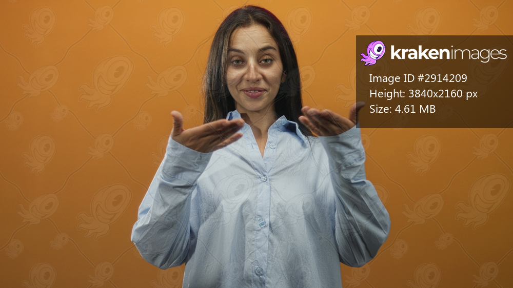 Young hispanic woman showing open palms presenting in studio with orange wall; confidence approachability.