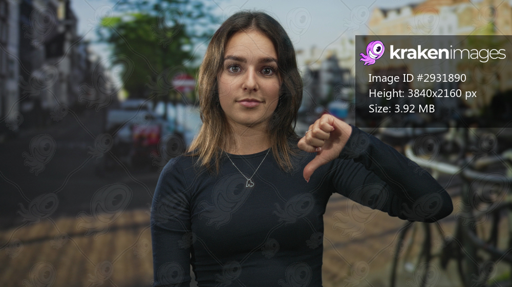 Young hispanic woman showing thumbs down with right hand and heart pendant necklace on amsterdam street near canal and parked bicycles; disapproval critique. - Kraken Images