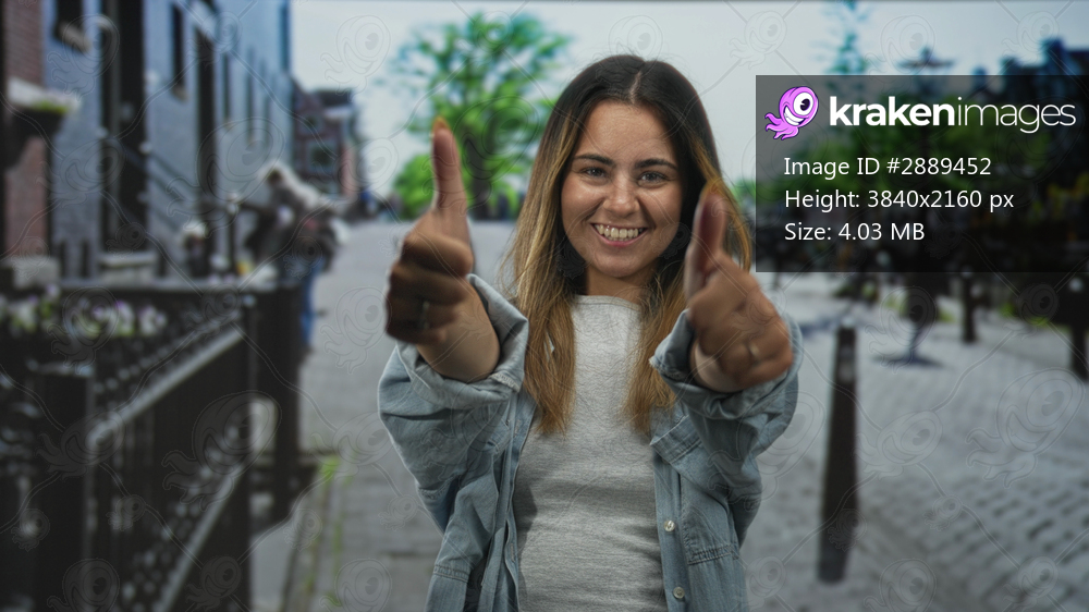 Young hispanic woman showing thumbs up and smiling on cobblestone city street with blurred buildings and trees; happiness confidence optimism.