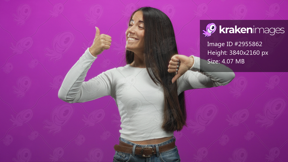 Young hispanic woman showing thumbs up and thumbs down with hands and visible midriff wearing white top in studio; uncertainty.