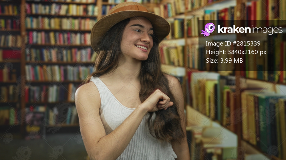 Young hispanic woman shows a friendly fist bump gesture in a library building lined with book shelves and warm light; solidarity.