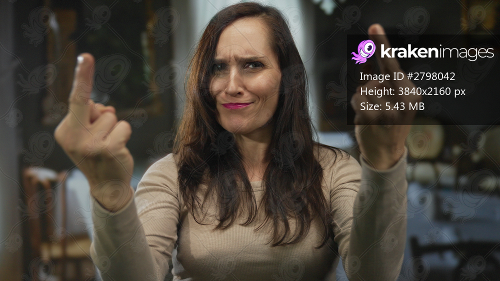 Young hispanic woman shows both middle fingers and smiles in a busy restaurant dining area; defiance sarcasm.