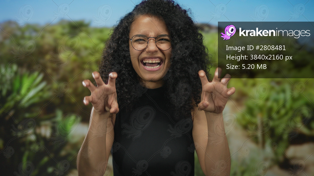 Young hispanic woman shows claw gesture with hands in green park under bright sunlight; playful confidence.