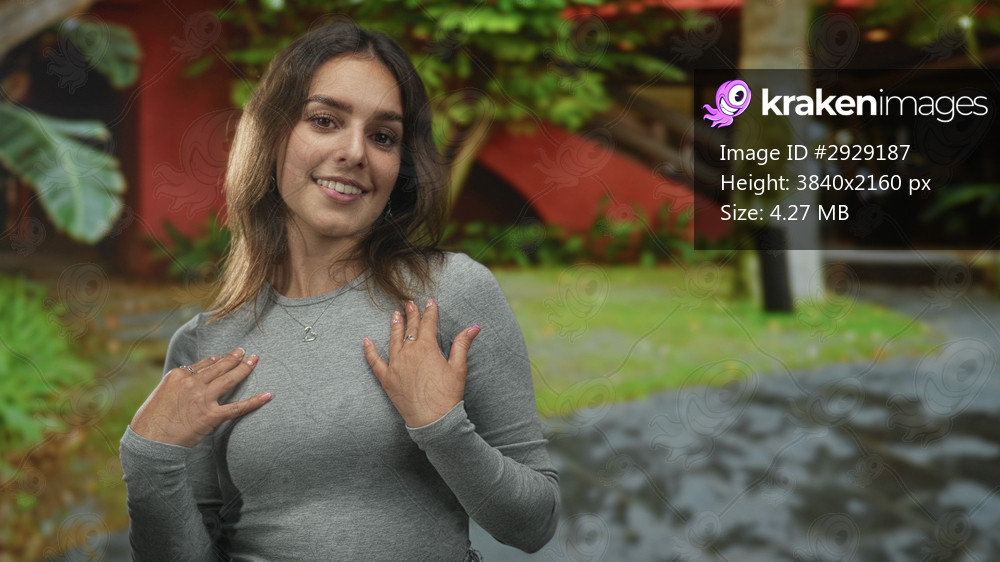 Young hispanic woman shows hands with rings and points finger to building near tropical plants and walkway; playful self expression.