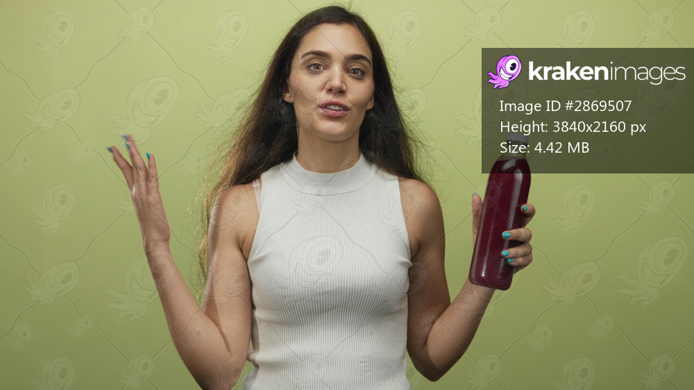 Young hispanic woman shows juice bottle with open hand in studio against green wall; nutrition wellness freshness confidence.
