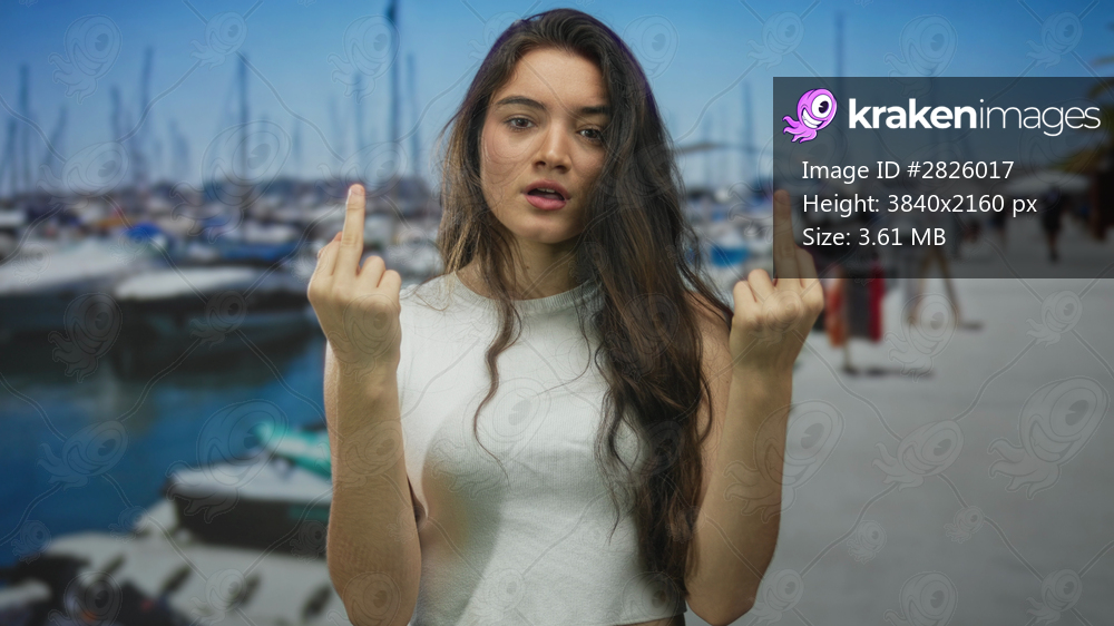 Young hispanic woman shows middle finger to docked boats on a sunlit street walkway by the harbor; rebellion.