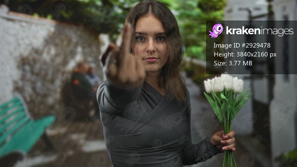 Young hispanic woman shows middle finger while holding white tulips on a narrow street with a bench; defiance.
