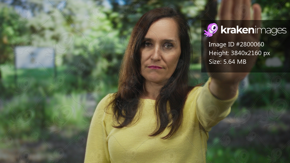 Young hispanic woman shows palm forward stop gesture in green park outdoors; assertion protection confidence.