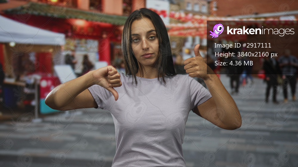 Young hispanic woman shows thumbs up and thumbs down with bare hands and smiling face on a busy street market with lanterns and pedestrians; ambivalence choice. - Kraken Images