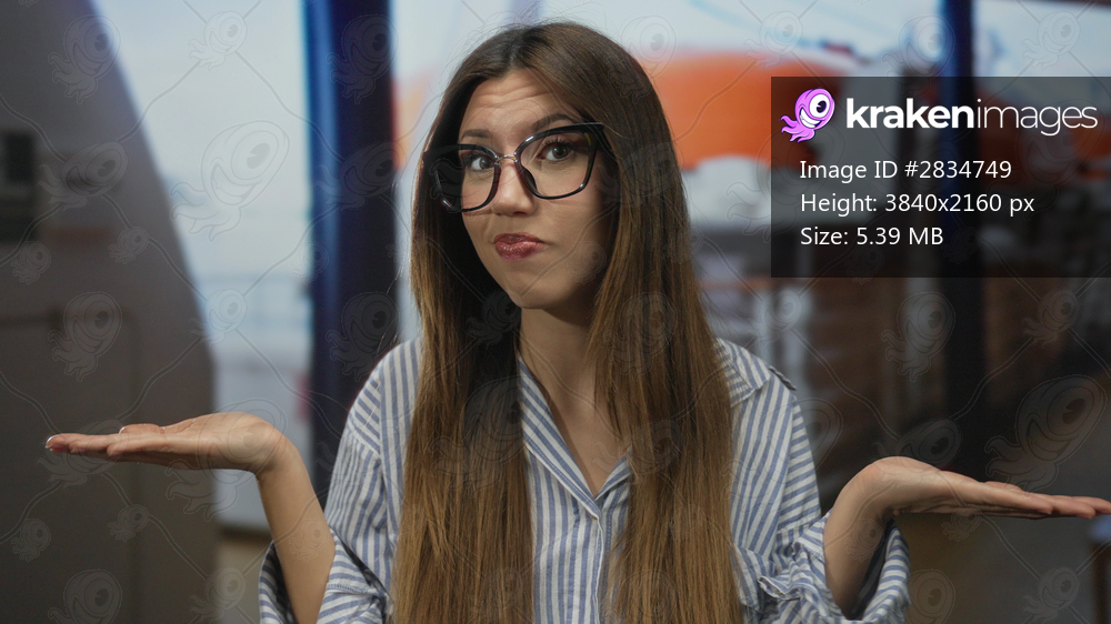 Young hispanic woman shrugging both hands on a sunlit boat deck by the cruise railing; uncertainty.