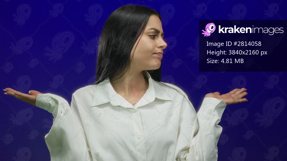 Young hispanic woman shrugs with indecision in front of a blue background, extending her hands sideways expressing doubt and confusion in an isolated setting. - Kraken Images