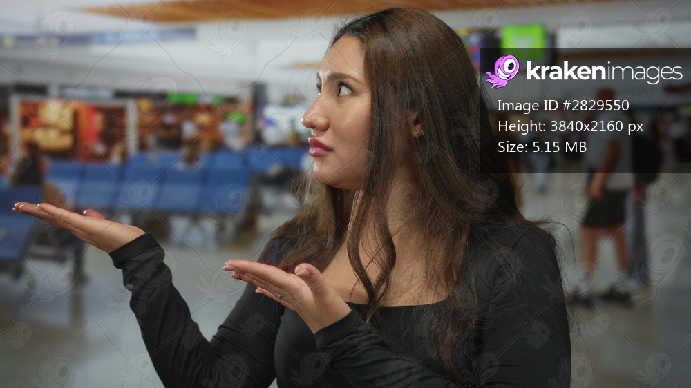Young hispanic woman shrugs open palms in busy airport terminal waiting area; confusion uncertainty frustration.