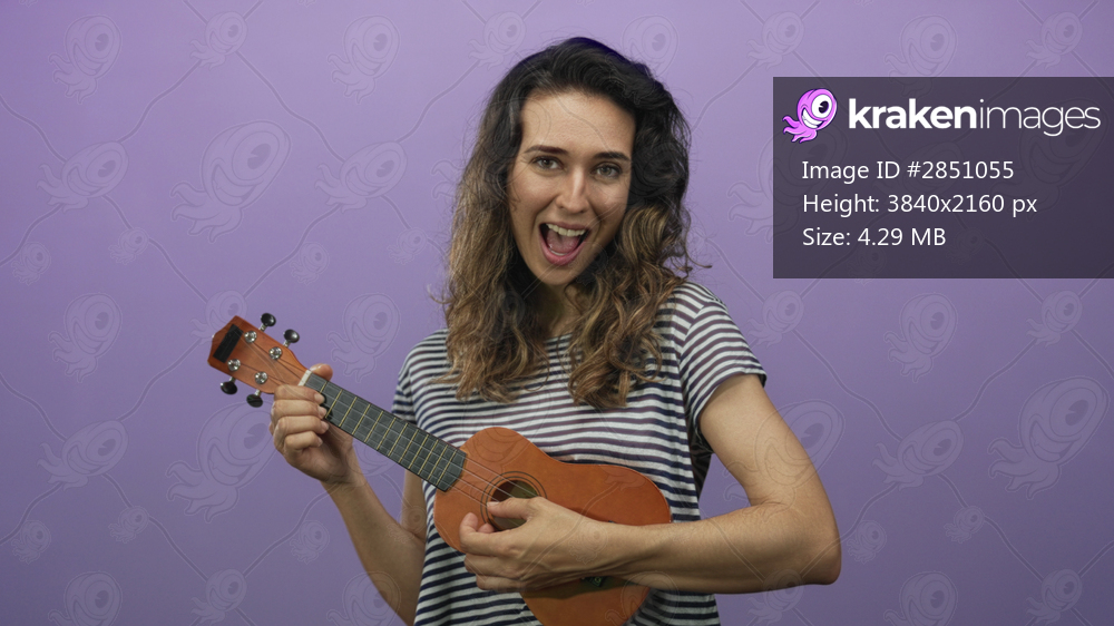 Young hispanic woman sings and skillfully strums tiny wooden acoustic ukulele in purple studio; creativity joy.