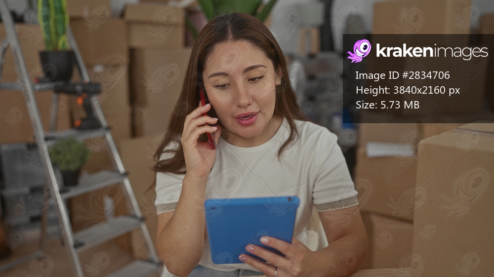 Young hispanic woman sitting and holding tablet while talking on smartphone in building; focused planning.