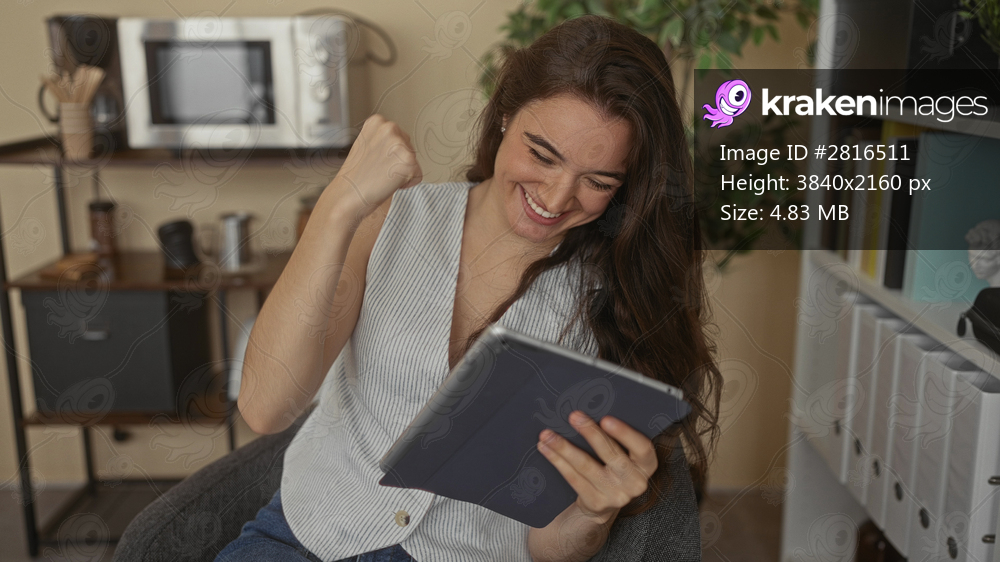 Young hispanic woman sitting in office building holding tablet and pumping fist in a cheerful gesture; success.