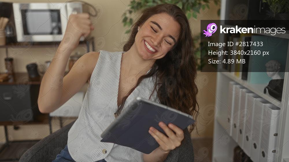 Young hispanic woman sitting in office building holding tablet and pumping fist in a cheerful gesture; success.