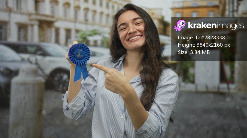 Young hispanic woman smiles as she holds blue ribbon and points finger to ribbon on urban street; triumph joy.