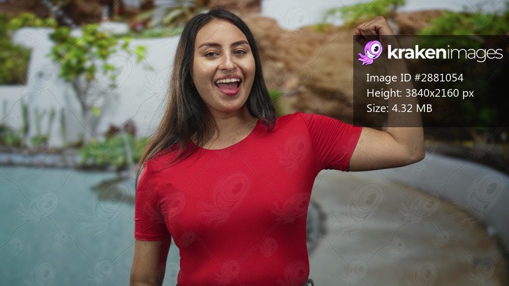 Young hispanic woman smiles and flexes her right arm at a poolside walkway in a bright red shirt with blurred tropical plants and rock wall; confidence strength. - Kraken Images