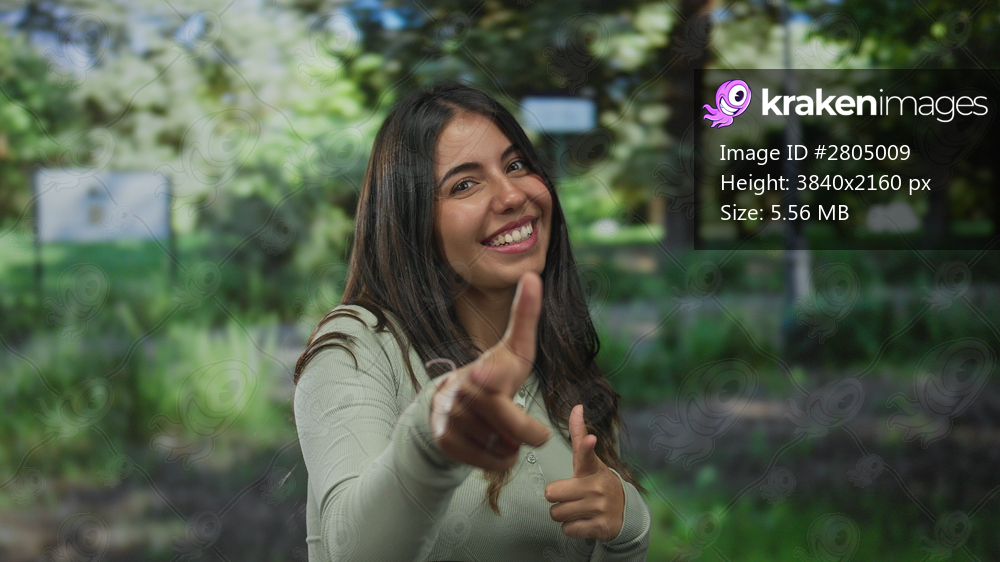 Young hispanic woman smiles with joyful grin and points finger to camera in a sunlit lush green park outdoors; playfulness.