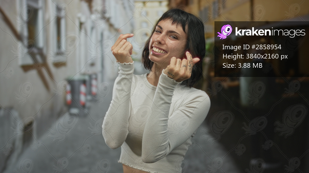 Young hispanic woman smiles and makes finger heart gesture on narrow outdoor street with historic building facades; affection friendship sincerity.