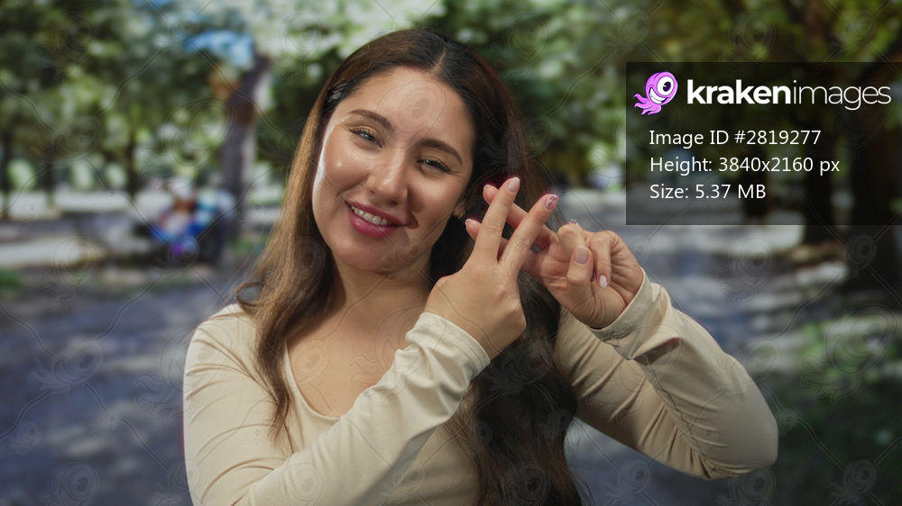 Young hispanic woman smiles and makes hashtag sign with hands in sunlit park path; youthful playfulness.