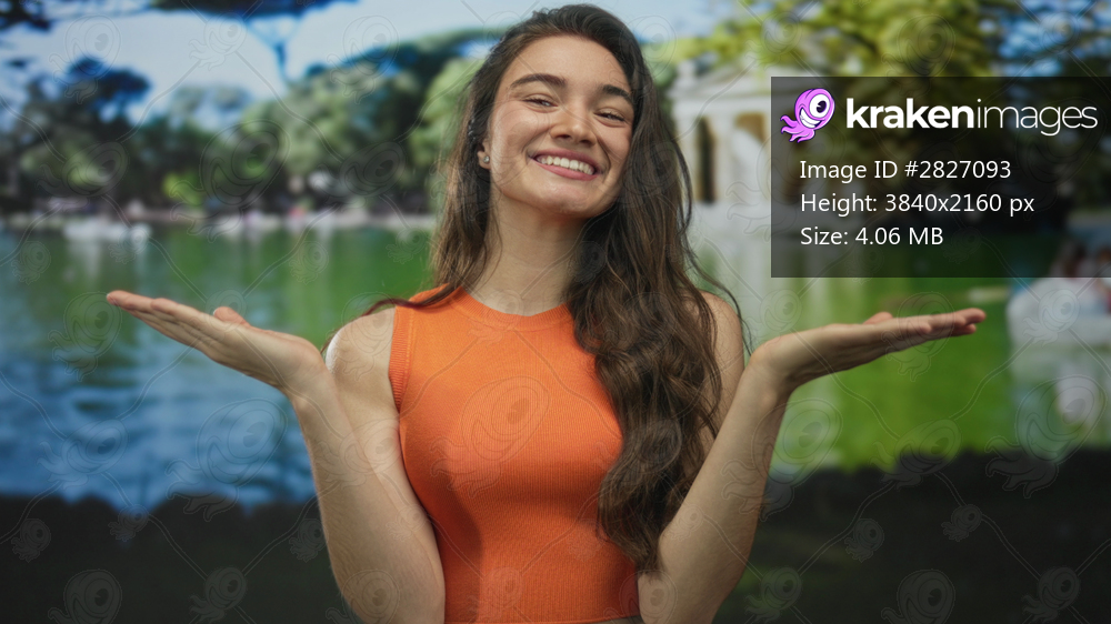 Young hispanic woman smiles with palms up and bare face in front of a building by a lakeside; optimism.